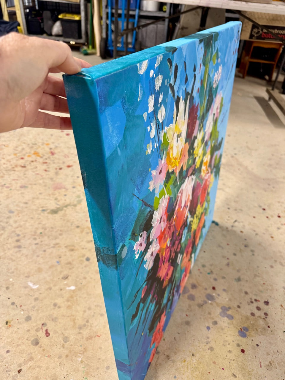 I painted it entirely with small paint rollers and added some lines with a squeeze bottle. A fun and vibrant painting!