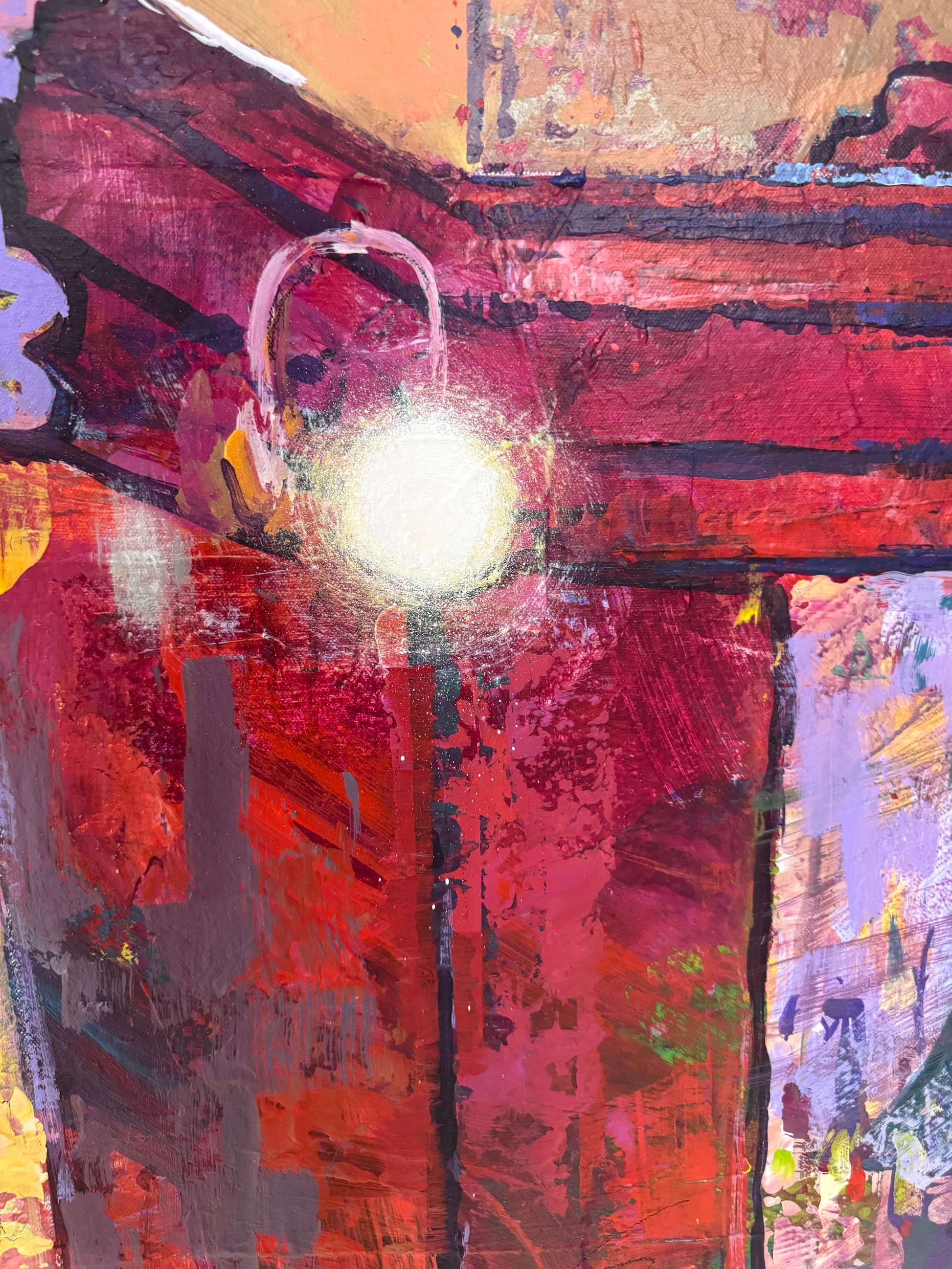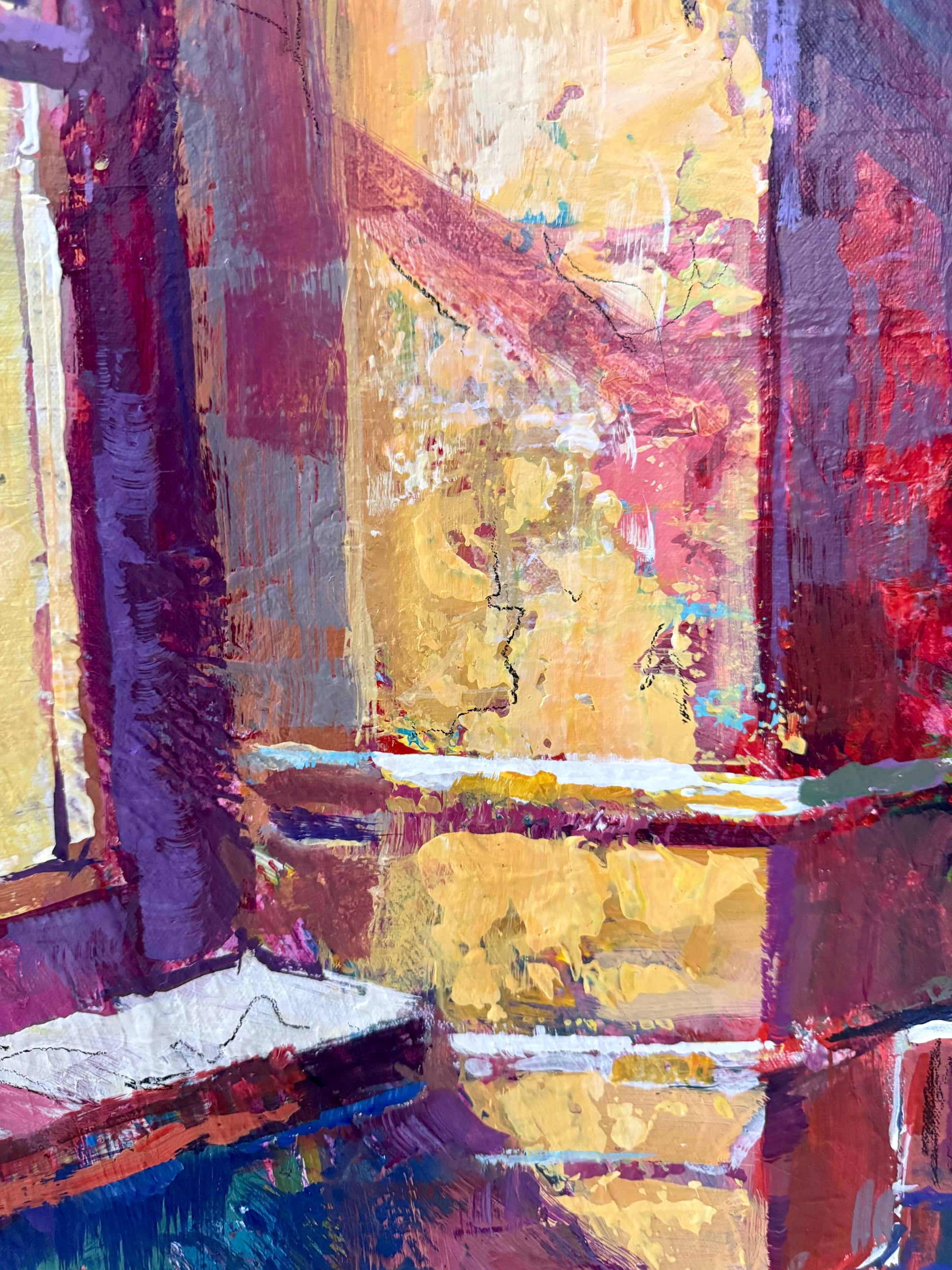 A vivid, textured scene built from loosely applied acrylics — thick palette-knife marks and free brushwork create glowing colour and a lively surface. Warm yellows and reds pulse against cool blues, capturing the joyful light of a French café.