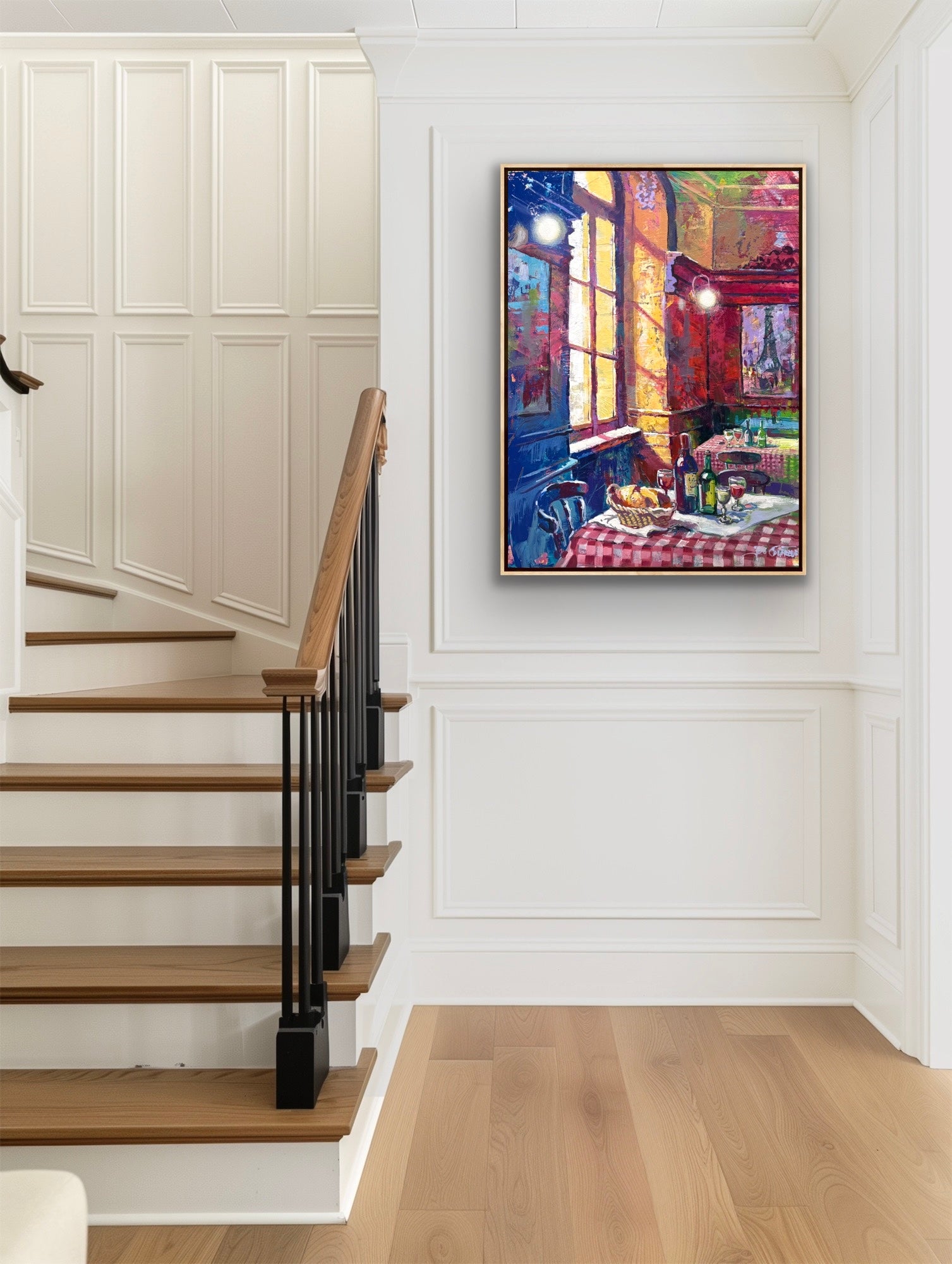 On a checkered cloth, a basket of crusty bread sits beside bottles and glasses of wine, celebrating simple pleasures of pain et vin in France. In the background, an Eiffel Tower print anchors the mood in Paris, all rendered with expressive colour and energy.