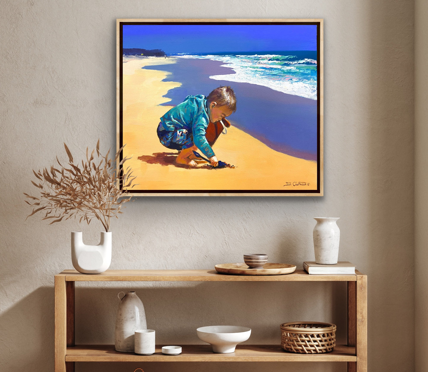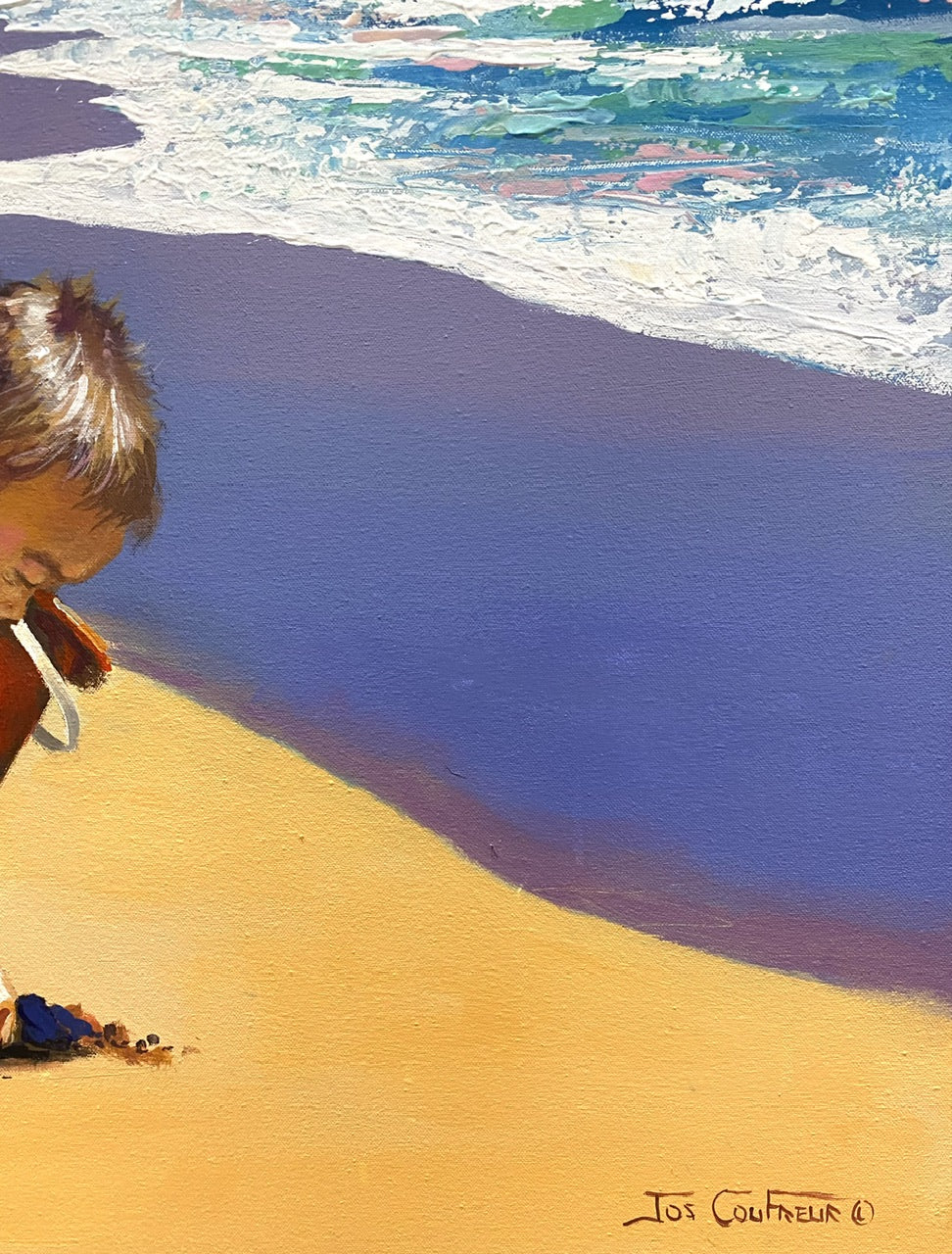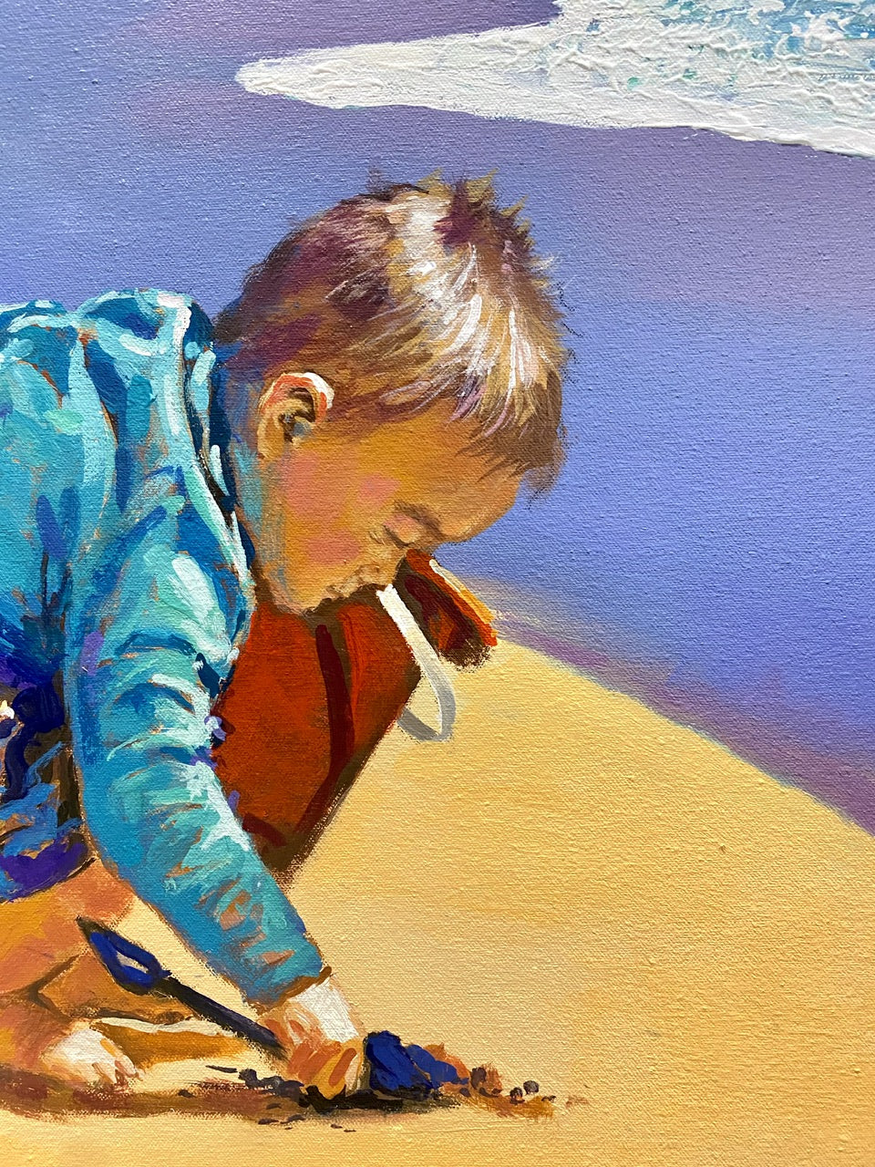 A colourful beach scene, with boy playing in the sand. About 20 years ago I used to paint lots of beach scenes, with children playing and people sitting and enjoying a summers day. I thought it was time to revisit this subject.
