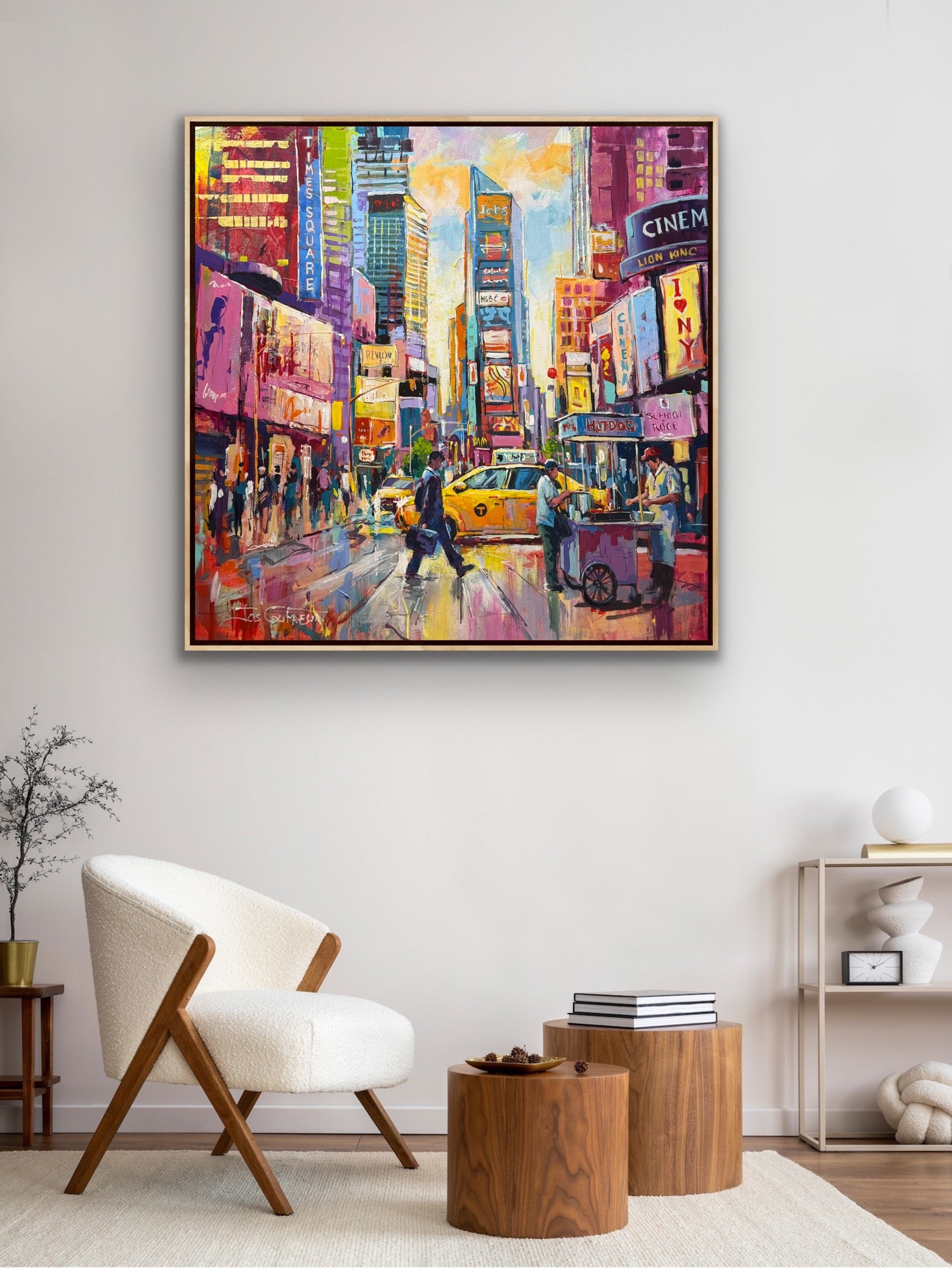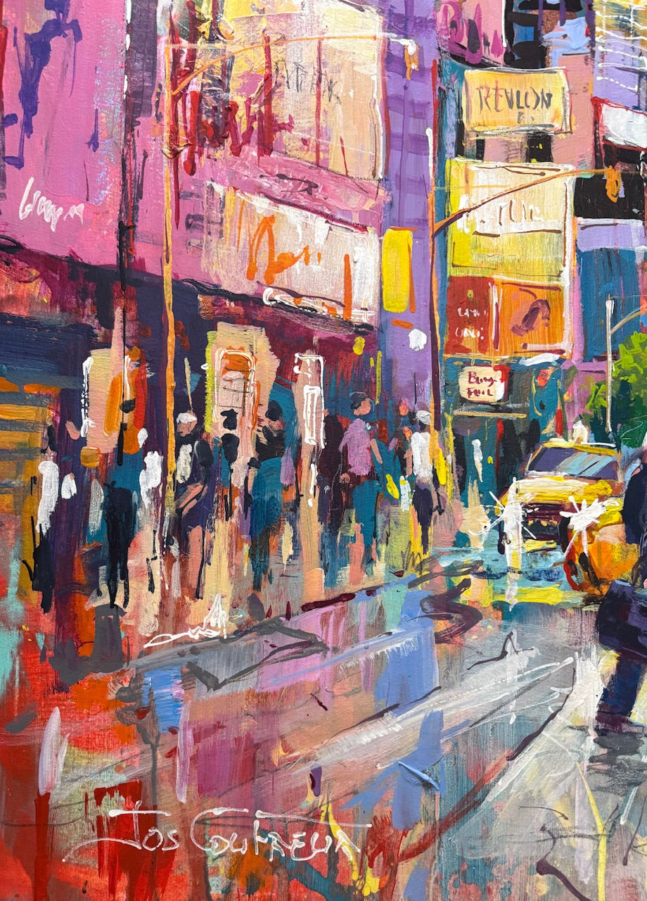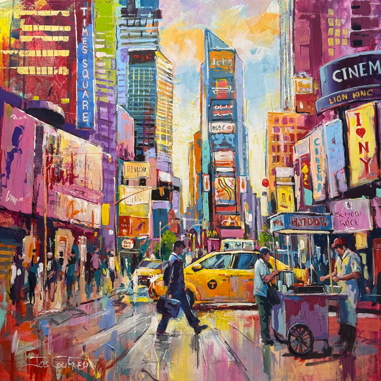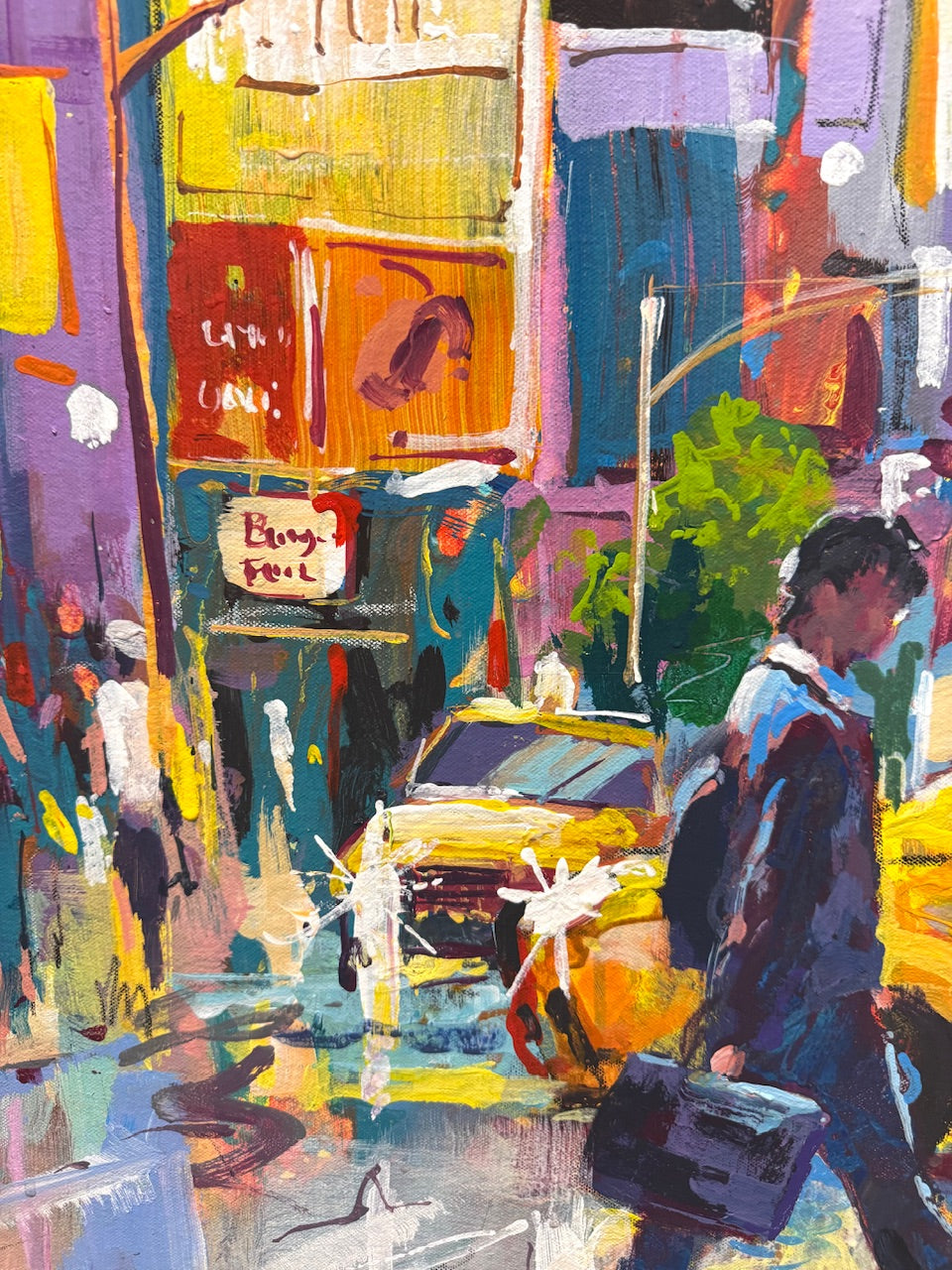 I like the hustle and bustle of a big city, to paint that is!! The hot dog stand just drew my eye, a small personal interaction in a big city. I paint with big brushes and bold loose brush strokes in vibrant colours.