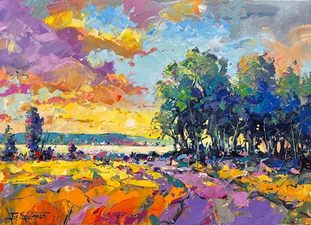 I painted this lakeside road using bold, vibrant colours instead of realistic detail. The road guides the viewer through the composition and adds a sense of movement, while the sky becomes a dramatic element through its intense, vivid colours.