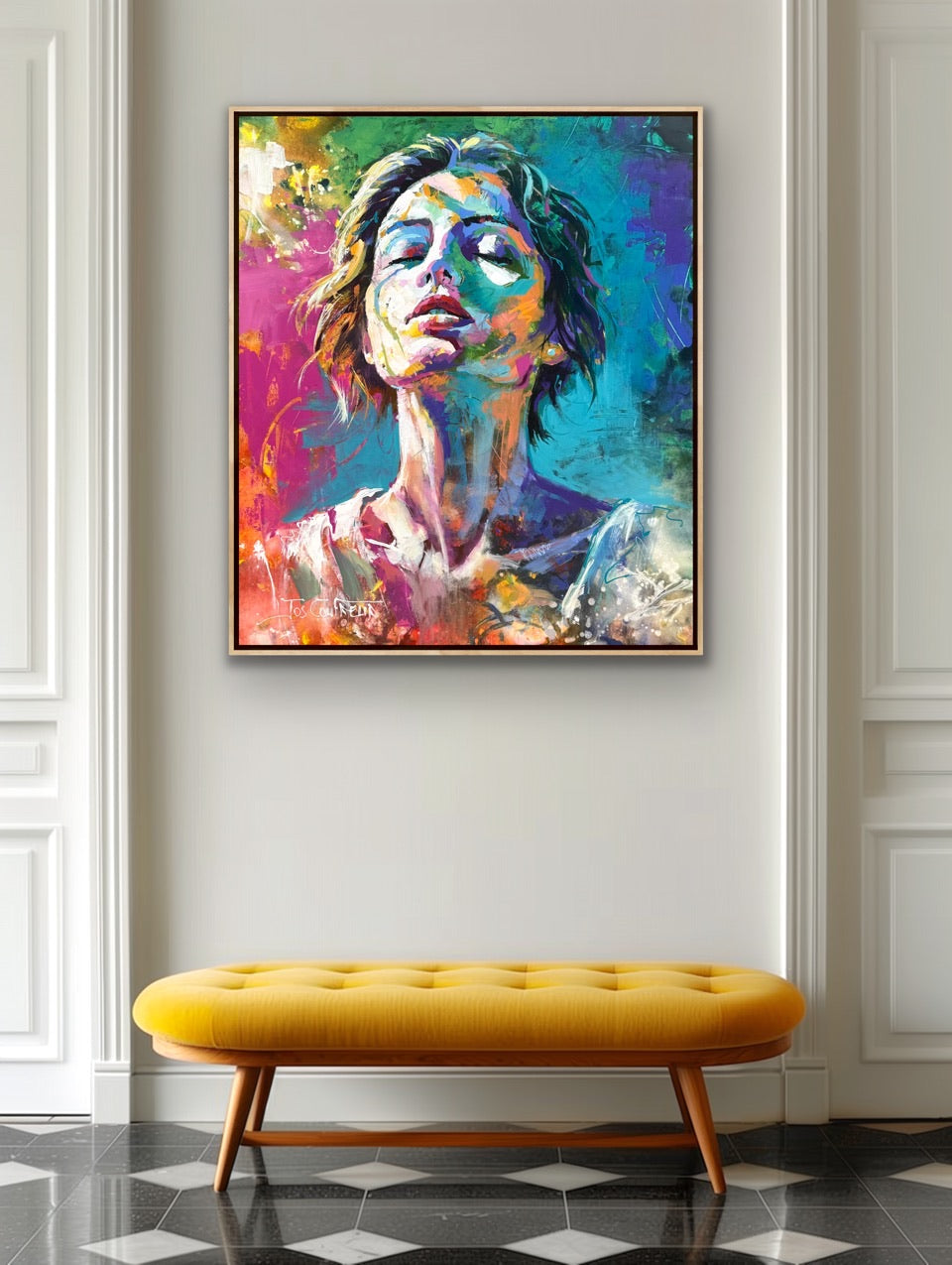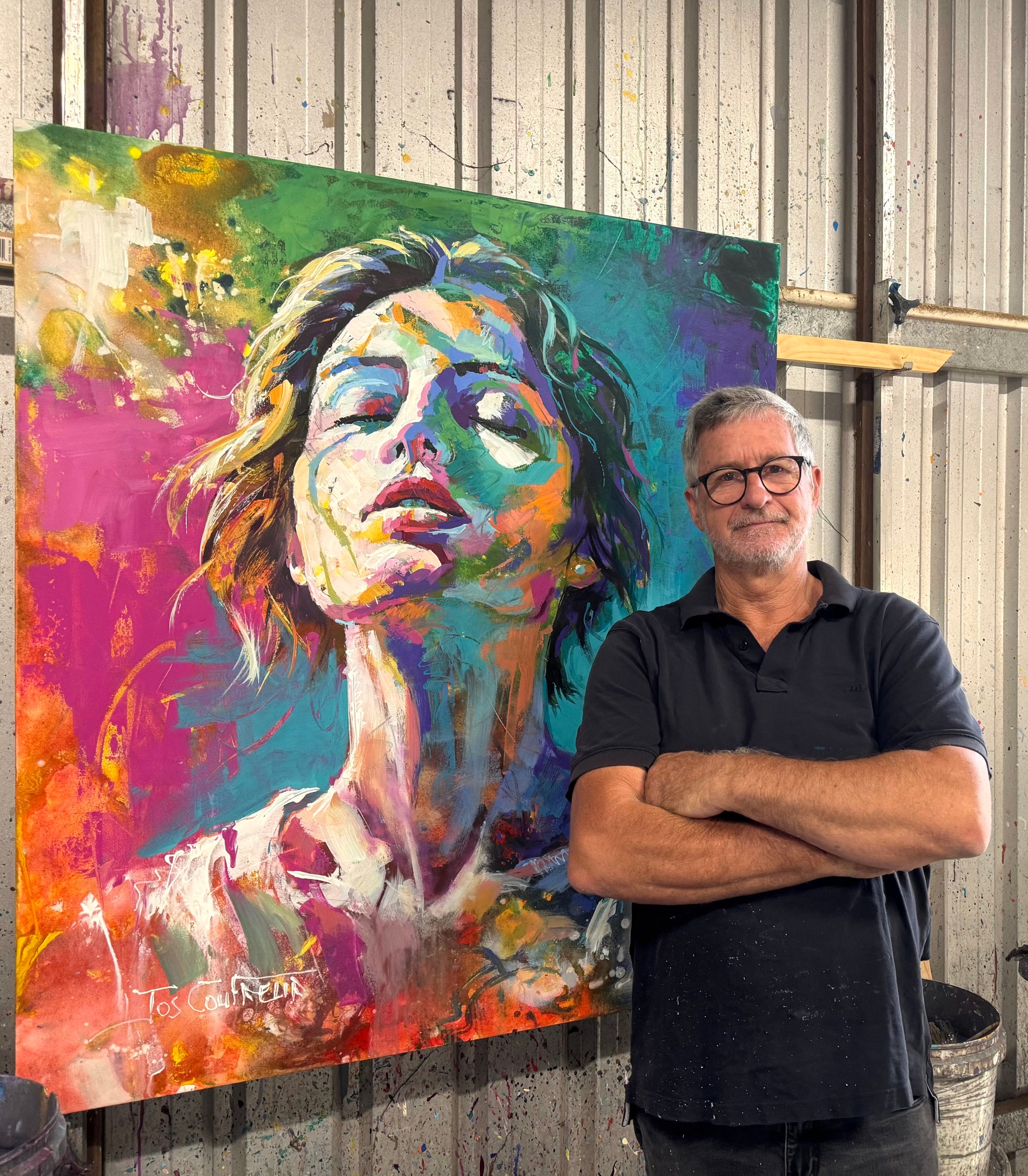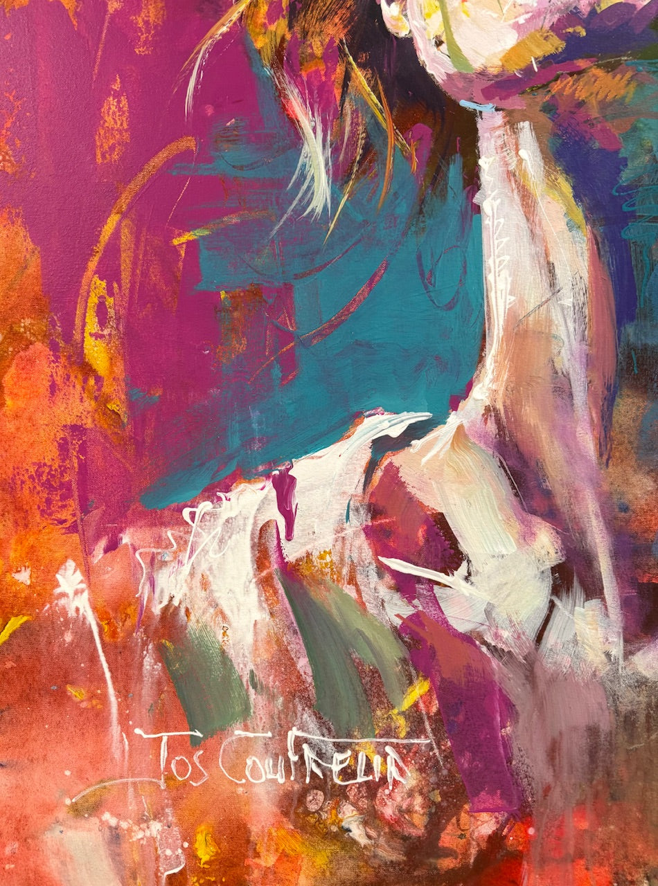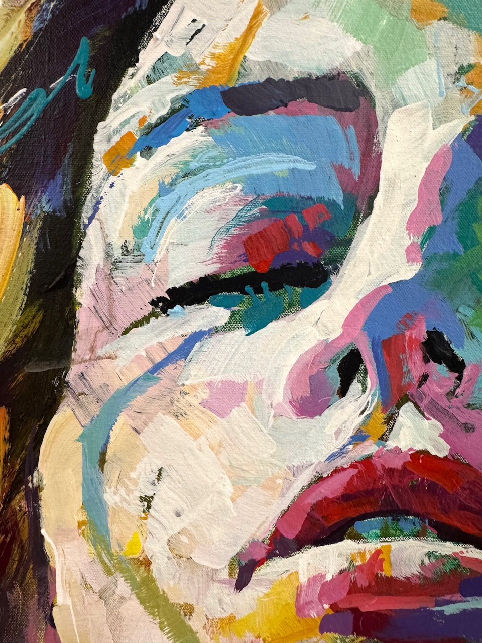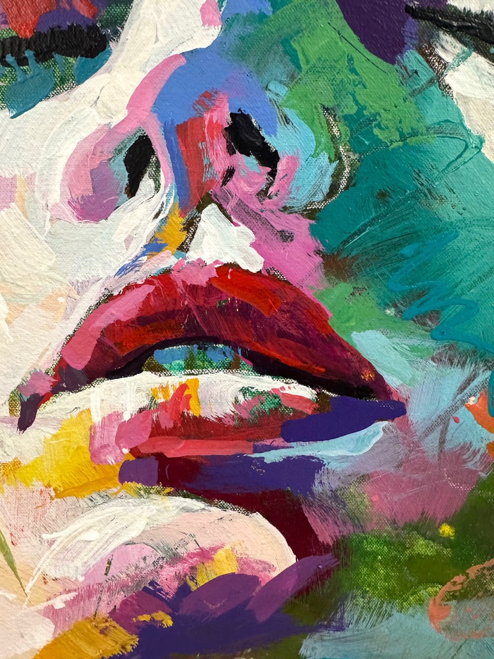 I built the portrait through layered, intuitive brushwork, allowing colour and movement to shape the form. Visible strokes and textured areas remain intentional, while contrasts of warm and cool tones create depth and light.