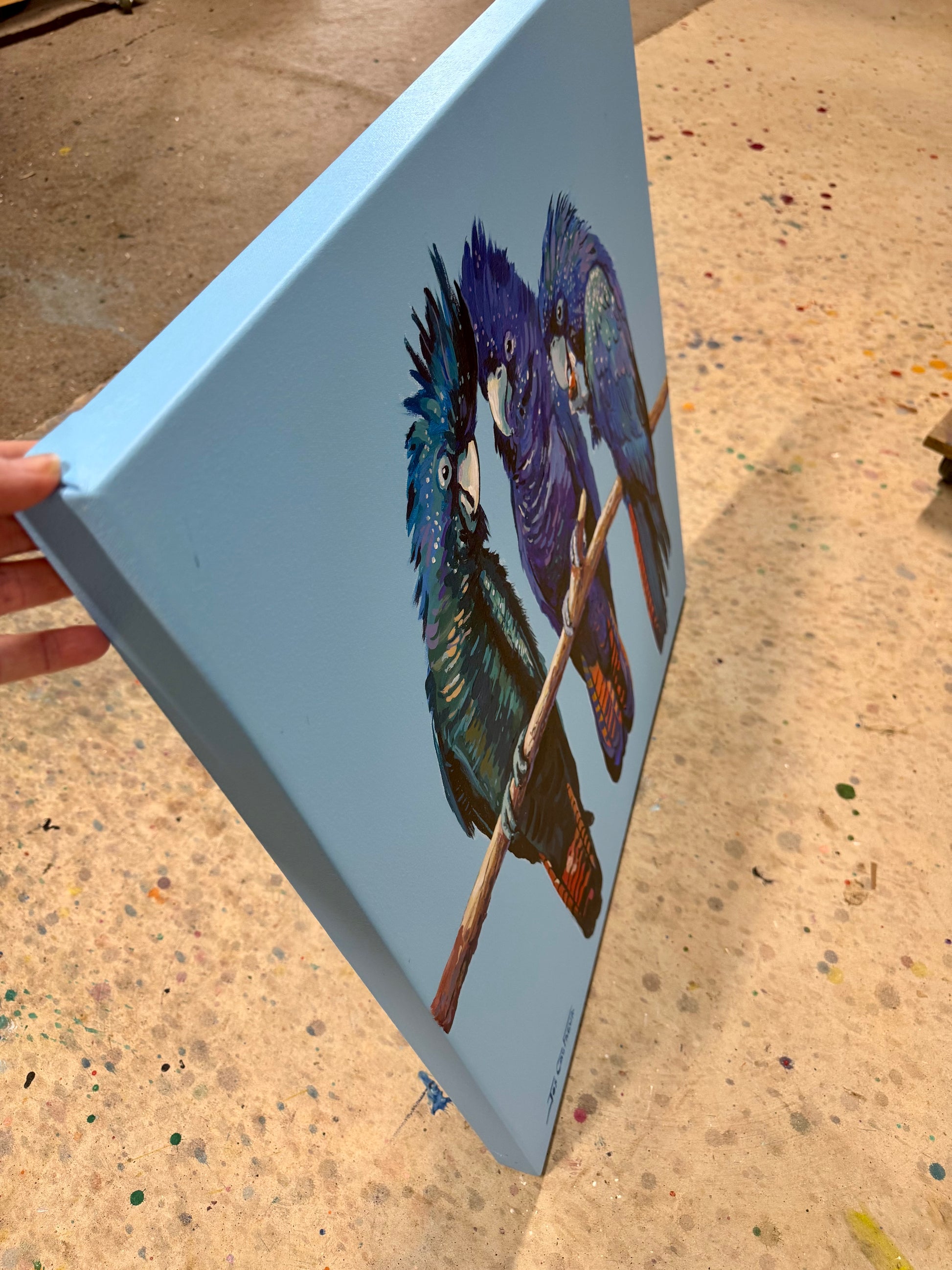 I painted these cockatoos not just to show their form, but to express their vibrant energy. Set against a bold sky blue, their black feathers come alive with purples, blues, and greens — capturing light, movement, and character.