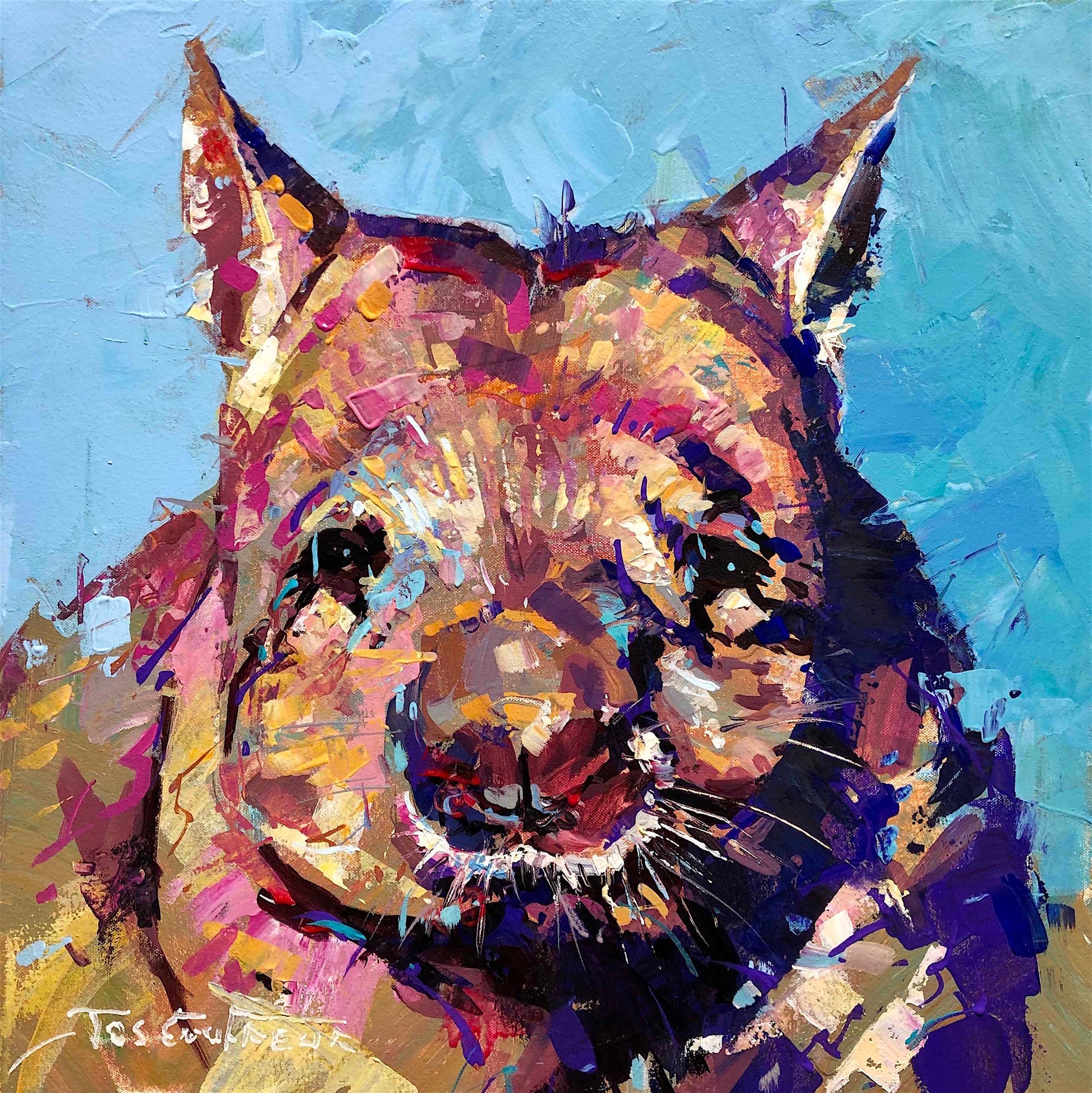 Portrait of an Australian Wombat in ochre, reds, pinks and dashes of other colours.