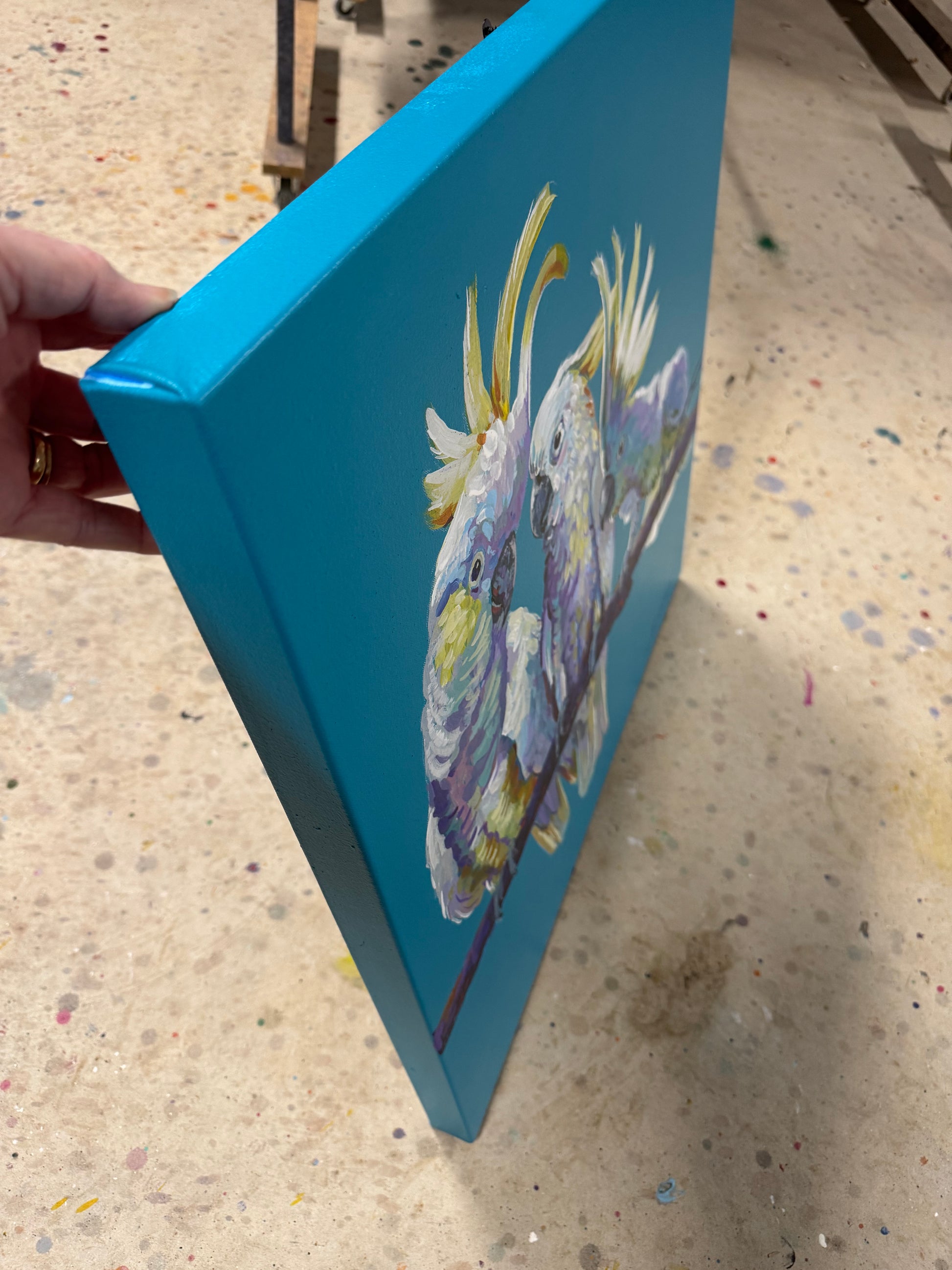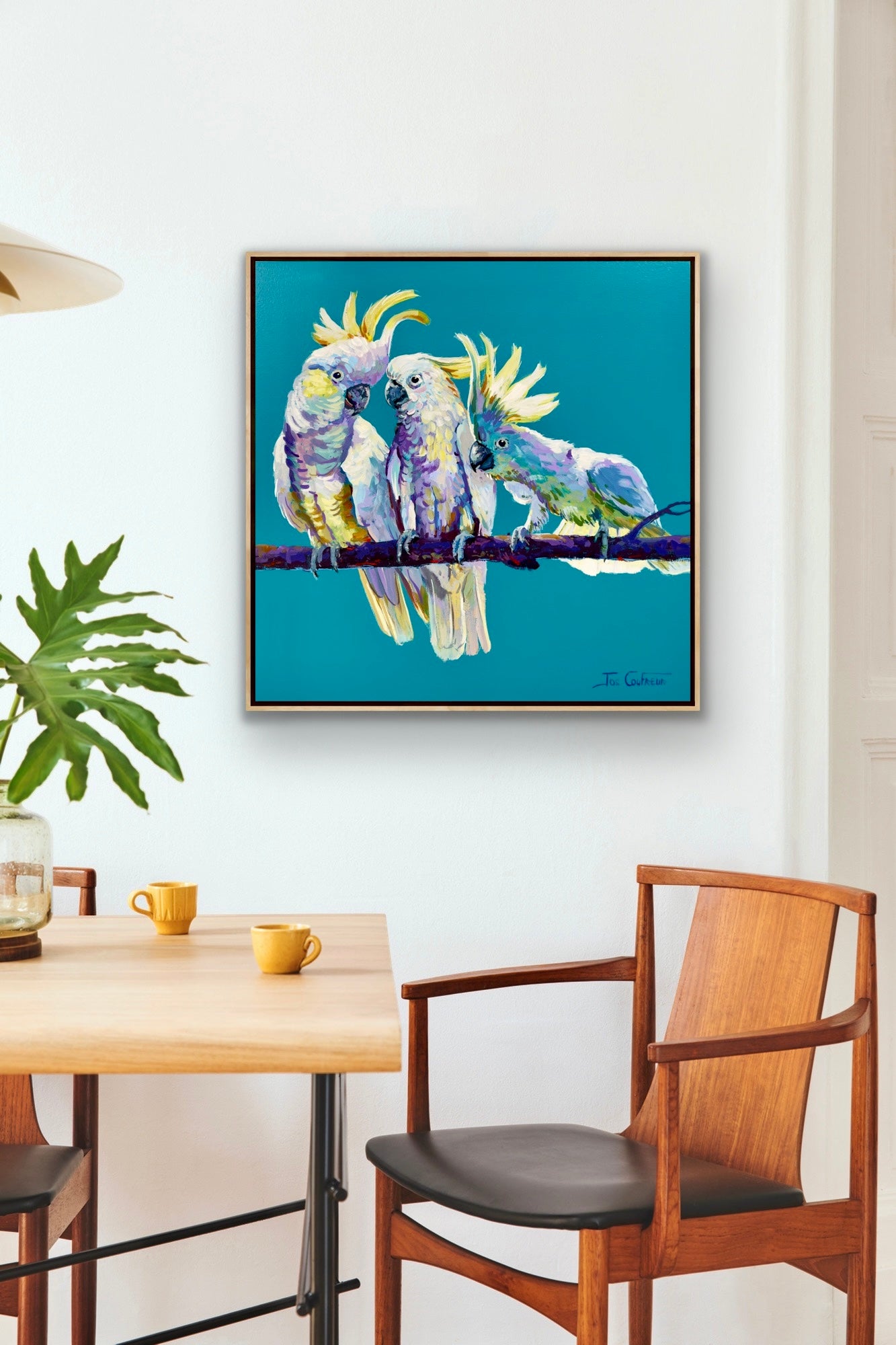 Three yellow-crested cockatoos perch playfully on a branch, brought to life with bold, expressive strokes and vibrant colours. Set against a striking turquoise background, their lively personalities shine through splashes of yellow, magenta, and teal. It’s not about realism—it’s about energy, movement, and the joy of nature in full colour.